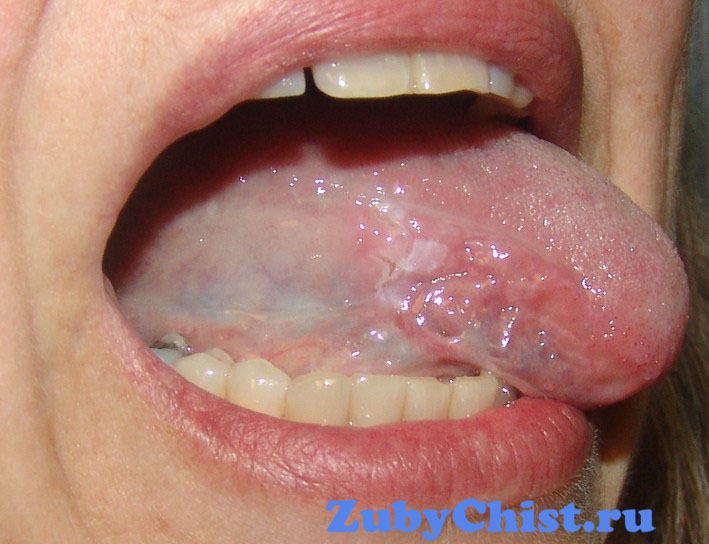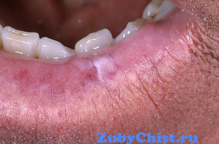 Визуально поражённые участки напоминают белые бляшки, на поверхности которых присутствует ороговение. Это состояние не всегда перерождается в злокачественный процесс и может исчезнуть даже при выполнении привычных гигиеничных норм ротовой полости. Однако, если воспаления слизистой рта локализуются около языка, шансы перехода в рак увеличиваются в несколько раз.